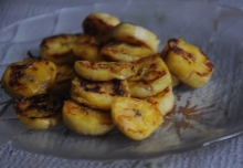 ತುಂಡು ಮಾಡಿದ ಬಾಳೆಹಣ್ಣನ್ನು ಬಿಸಿಯಾಗಿರುವ ಕಾವಲಿಯ ಮೇಳೆ ಇಟ್ಟು, ತುಪ್ಪ ಸವರಿ ‍ಕೆಂಪಗೆ ಕಾಯಿಸಿ
